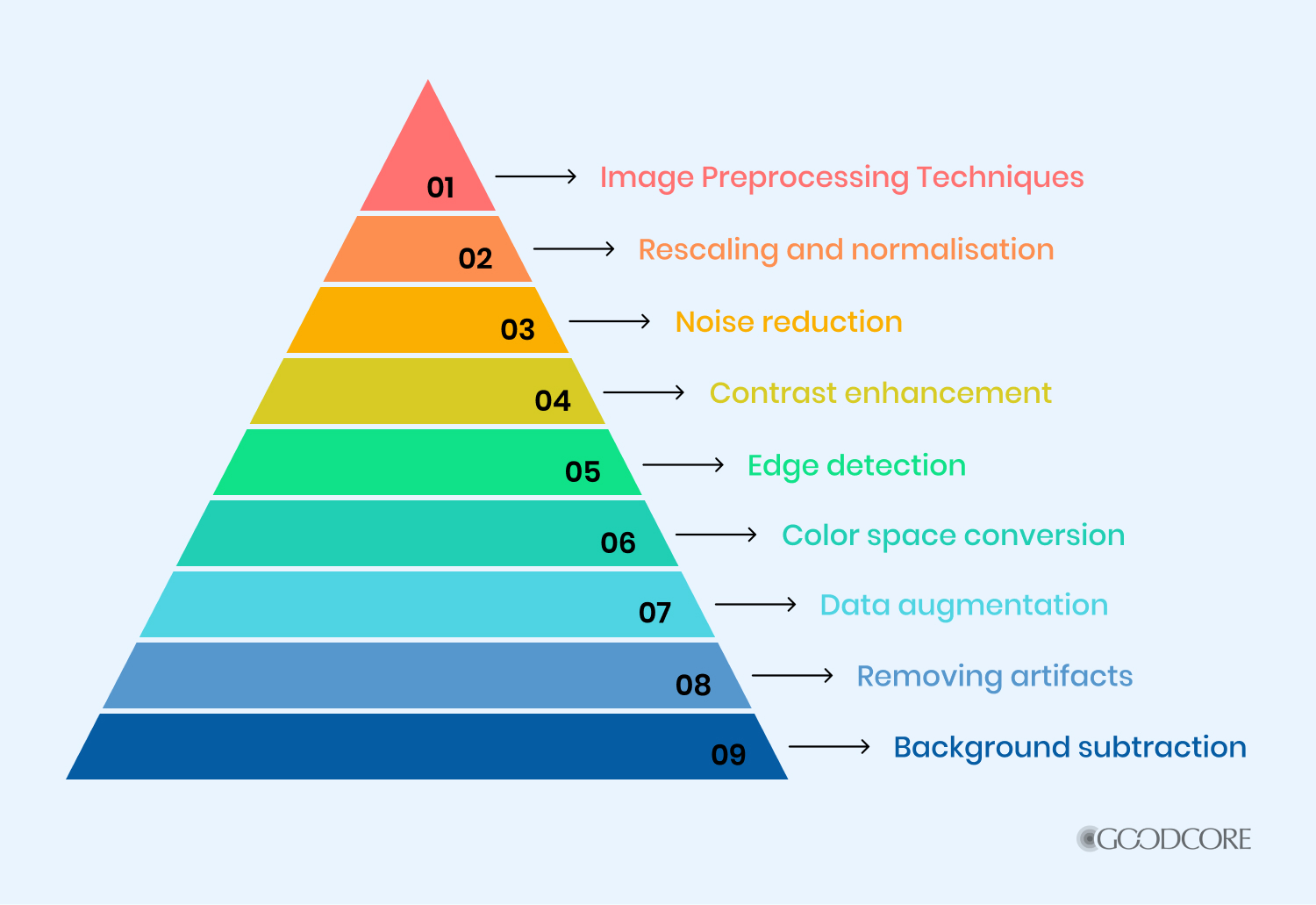 Preprocessing can involve a variety of techniques, depending on what the image needs. Some of the most common include: