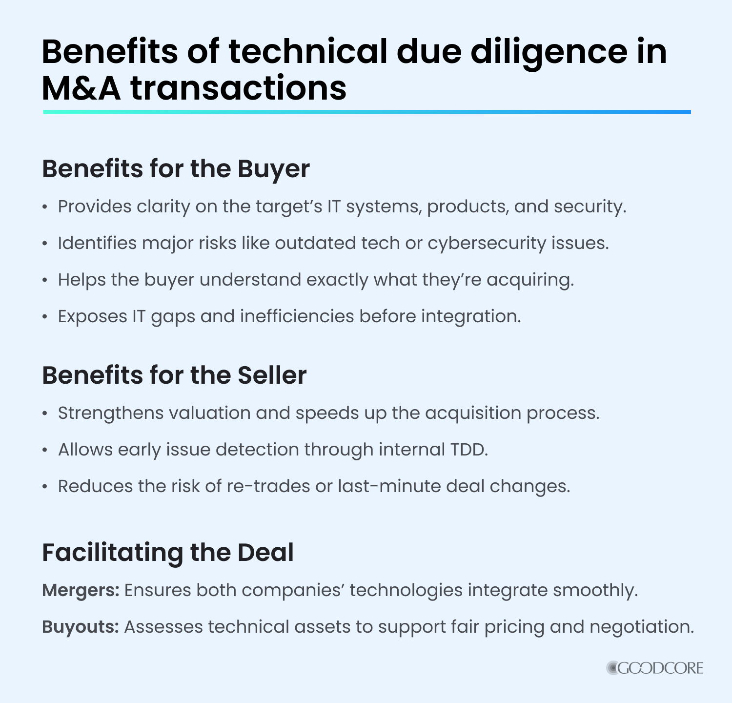 Technical due diligence isn’t something you hand to junior developers. It needs architect-level talent or senior engineering leadership – people who can see the bigger picture, not just lines of code.
